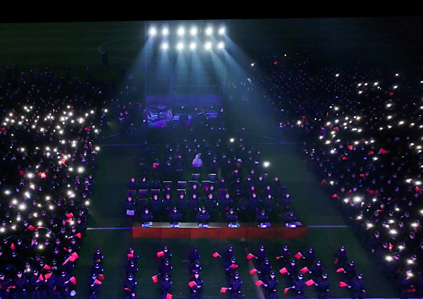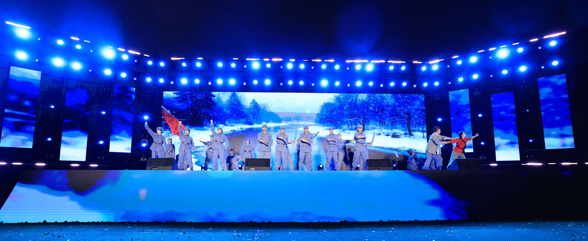 开场舞《胜利荣光》拉开晚会序幕,舞者们以有力的肢体语言,讲述先辈们如何于黑暗中寻光、于危难中坚守。在第一篇章“忠诚”中,音诗画《山河画卷》演奏了一曲中华儿女浩然正气的雄浑交响;歌舞表演《初心如炬》唱响追寻信仰、践行使命担当的信念。在第二篇章“英雄”中,教师诗朗诵《奋进正当时 警色谱华章》用坚定无悔的奋斗誓言,奏响吉林警察学院的时代强音;歌曲《共铭此刻》用婉转歌喉演绎青春乐章,回应师者教诲。在第三篇章“法治”中,乐器演奏《启》奋力书写中国式现代化挺膺担当的青春华章,教师枪操《使命担当》诠释捍卫平安的赤诚与力量,舞蹈《旭日东方》演绎于不懈奋斗中绽放绽放的绚丽之花。在第四篇章“纪律”中,警体拳《藏蓝力量》展现警院学子步履铿锵的坚韧,师生演唱《领航》唱响紧跟学院党委步伐、矢志不渝的使命方向。尾篇,全体师生共唱《强军战歌》,唱响以忠诚为誓言,以英雄为坐标,以法治为根基,以纪律为铠甲的坚定信念。