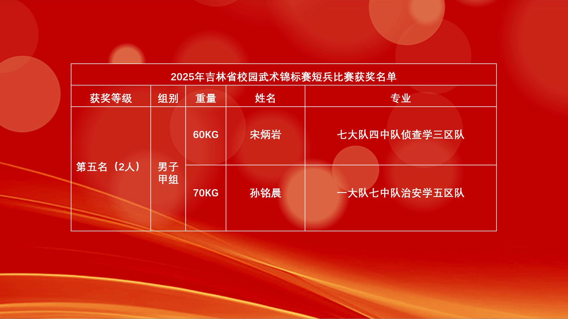 2025年10月18至19日,吉林省校园武术锦标赛短兵比赛在吉林体育学院圆满落幕。吉林警察学院参赛队捷报频传,勇夺9枚金牌、6枚银牌、5枚铜牌,实现历史性突破!充分展现了吉林警察学院学子精湛的武术技艺与顽强的拼搏精神。